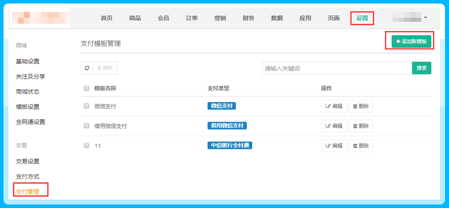 第一步:在设置----支付管理----添加新模板,参见下图: