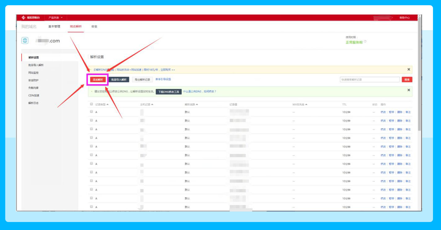 c、进入域名解析界面,点击“添加解析”