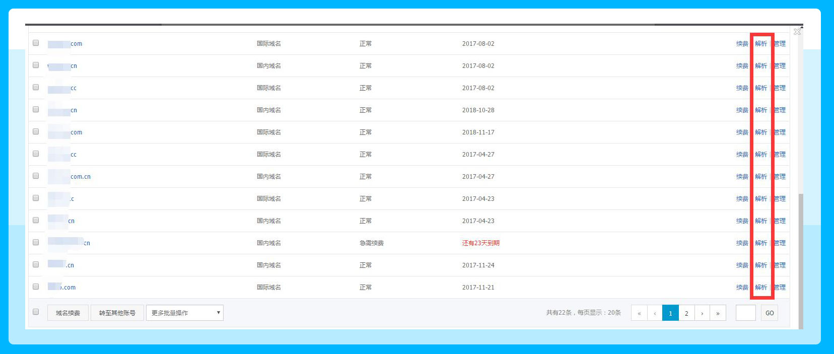 b、会显示出你购买的域名,在域名的右侧最边有续费、解析、管理,直接点击解析就可以