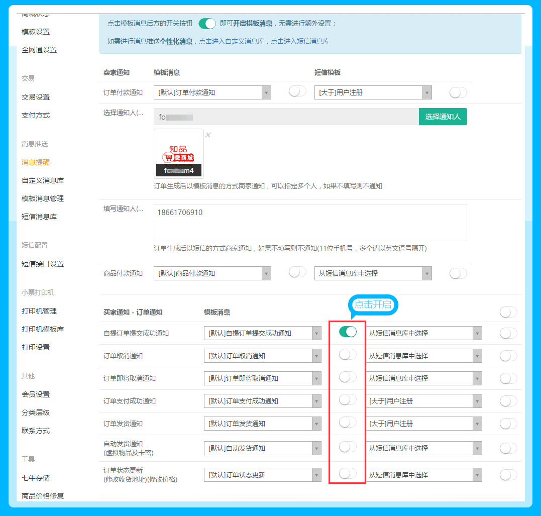 知品微商城将模板消息库升级为消息推送库,模板消息库升级为自定义消息库,升级的用户需要重新开启消息提醒按钮,才能正常有消息提醒的哦,参见下图:
