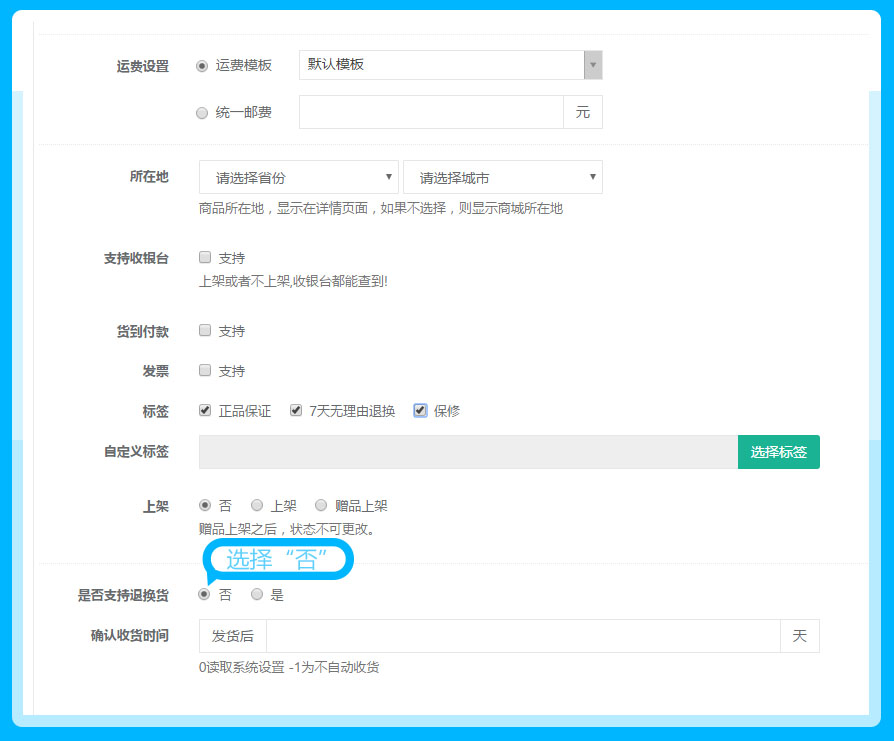 商品——商品编辑——基础——是否支持退换货——否,参见下图: