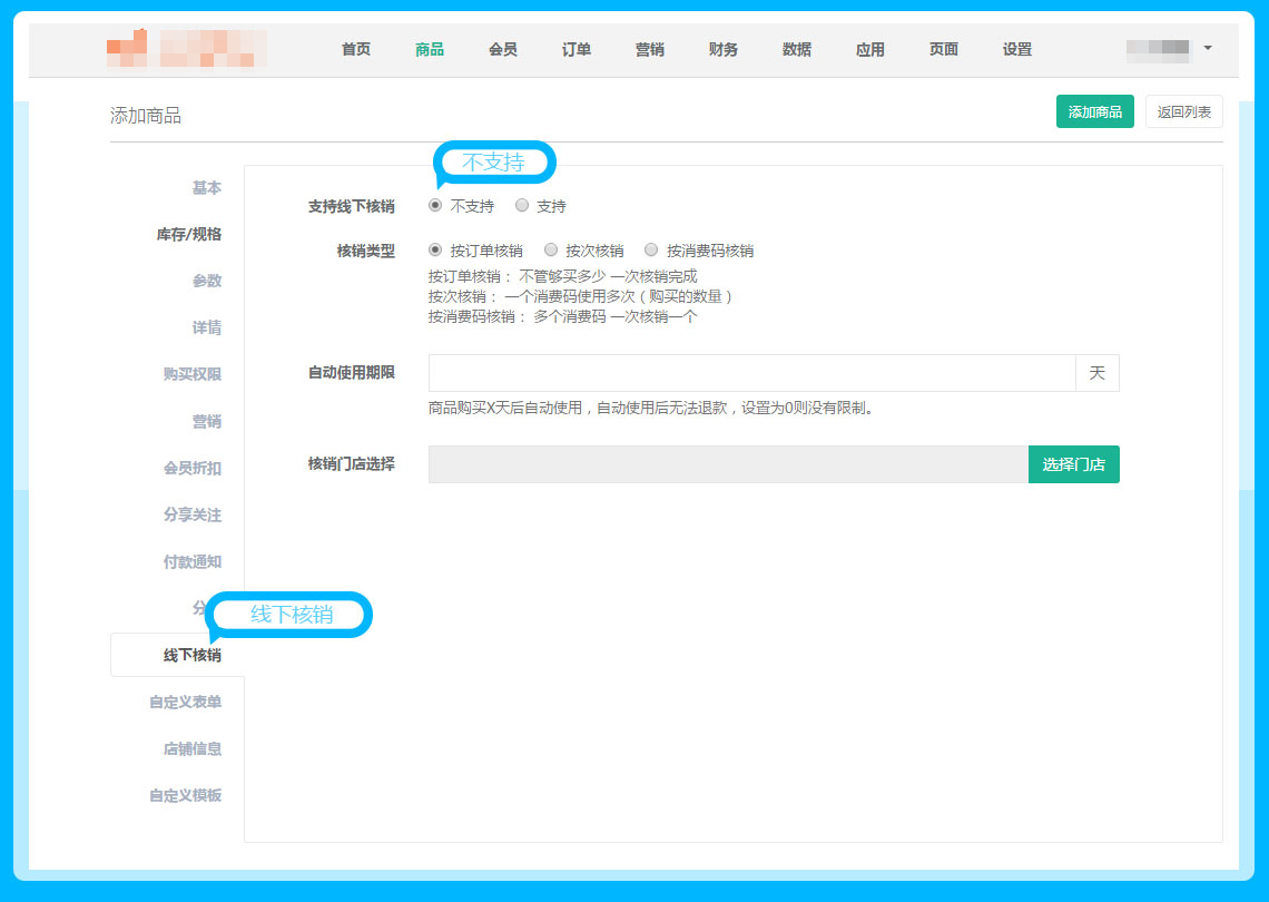 商品——商品编辑——线下核销——不支持,参见下图: