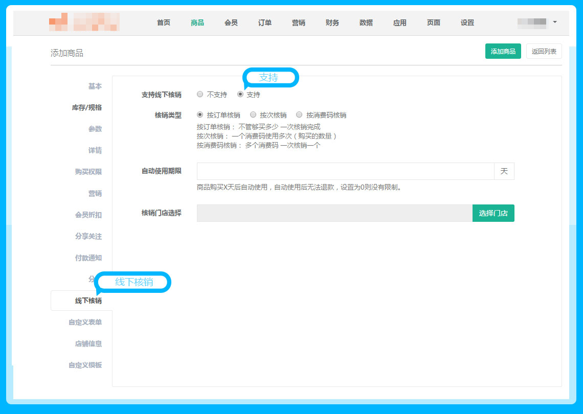 商品——商品编辑——线下核销——支持,参见下图: