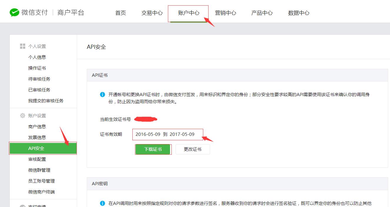 2. 【账户中心】--【API安全】,请检查证书有效期在可使用范围,然后下载证书,参见下图: