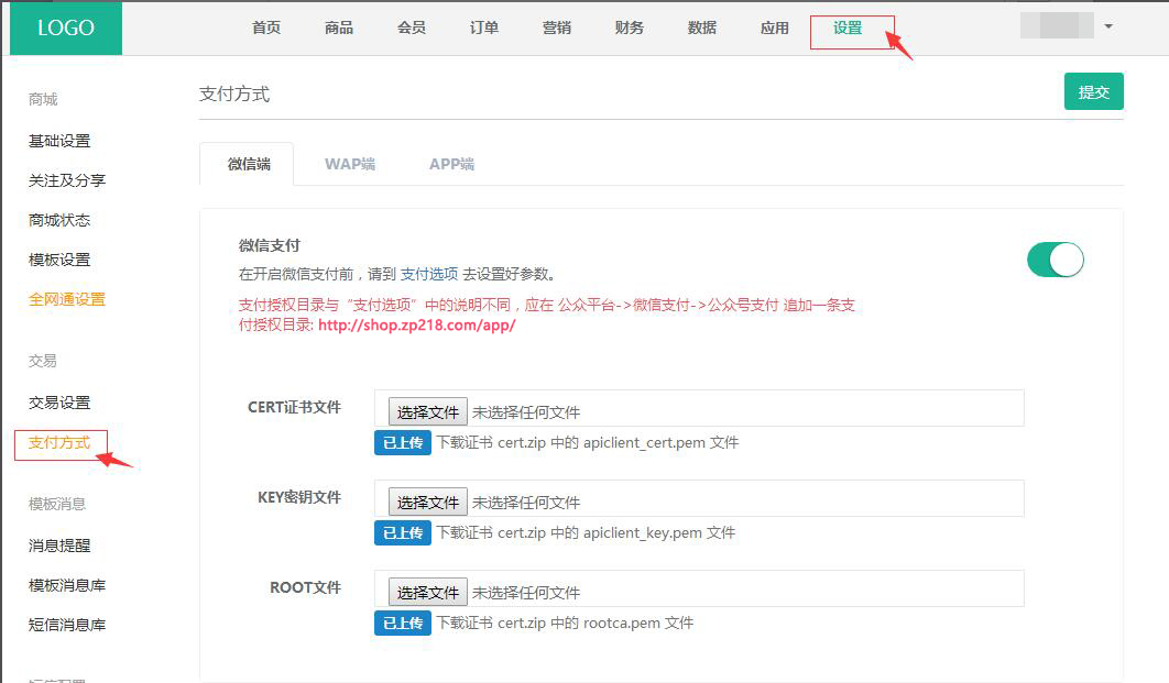 3.打开商城后台,【设置】--【支付方式】,选择新下载对应的文件,重新上传保存即可,参见下图:
