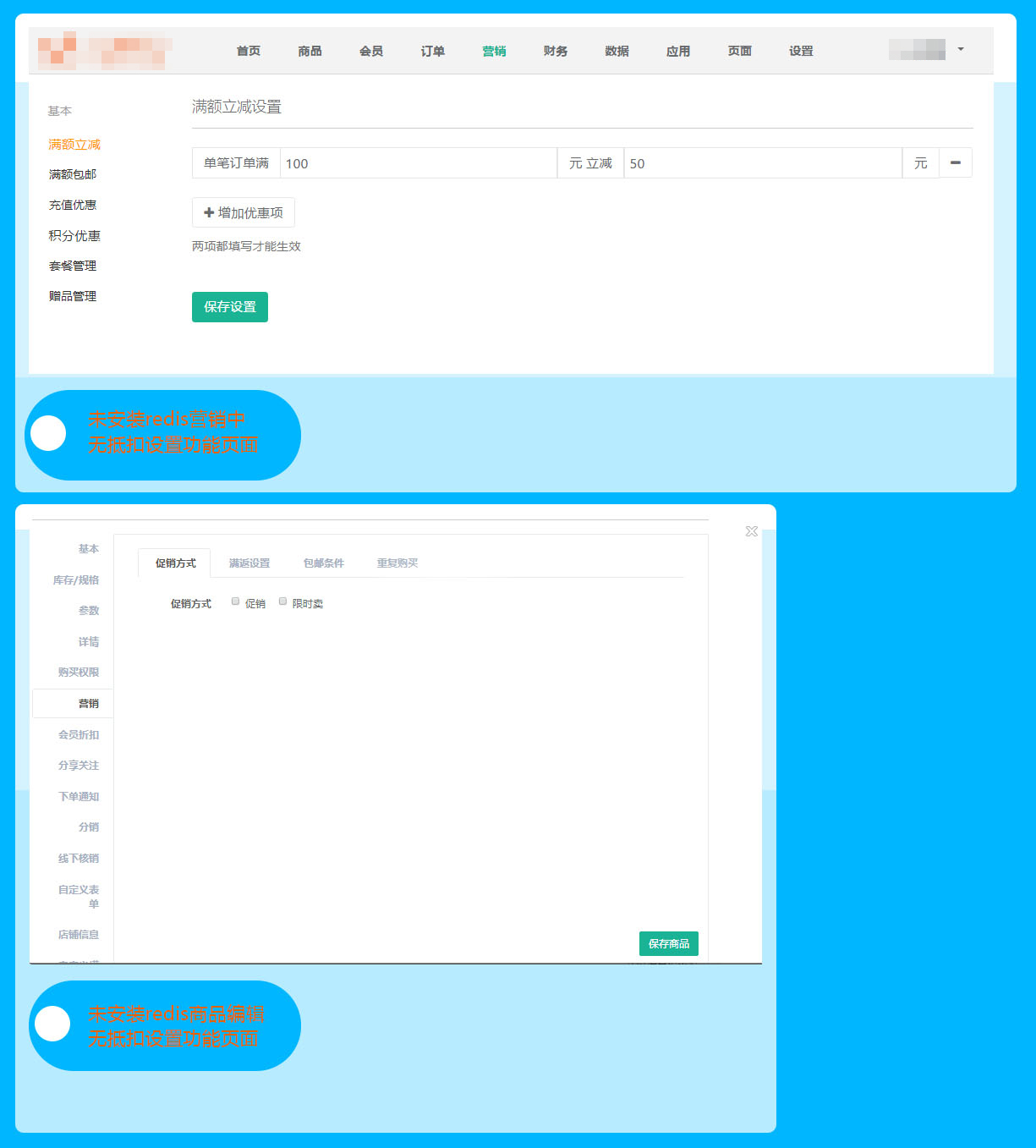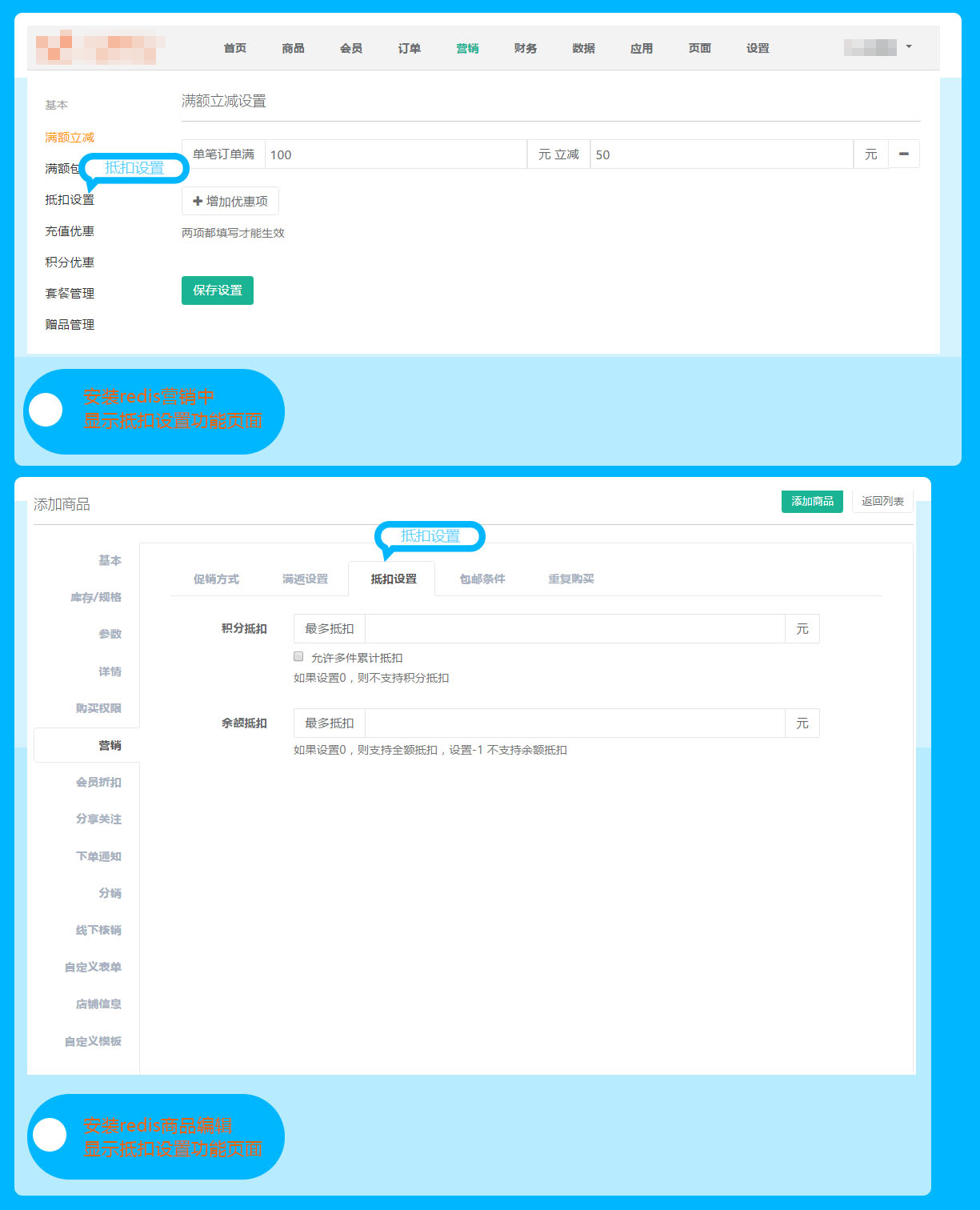 更新后【营销】中没有了抵扣设置和商品编辑页面中抵扣设置功能后,需要安装redis才能正常使用哦!