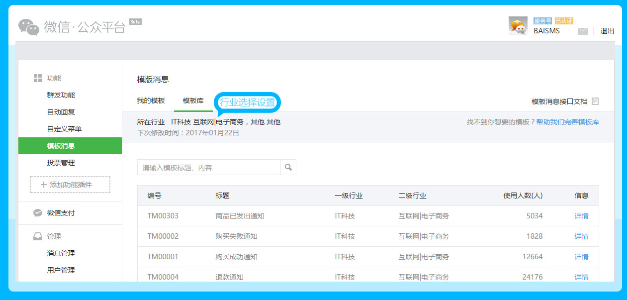 解决方法:需要商家到接入商城的微信公众平台模板消息所在行业选择为: IT科技/互联网|电子商务, 其他/其他,一定要严格按照规定的所属行业选择,参见下图: