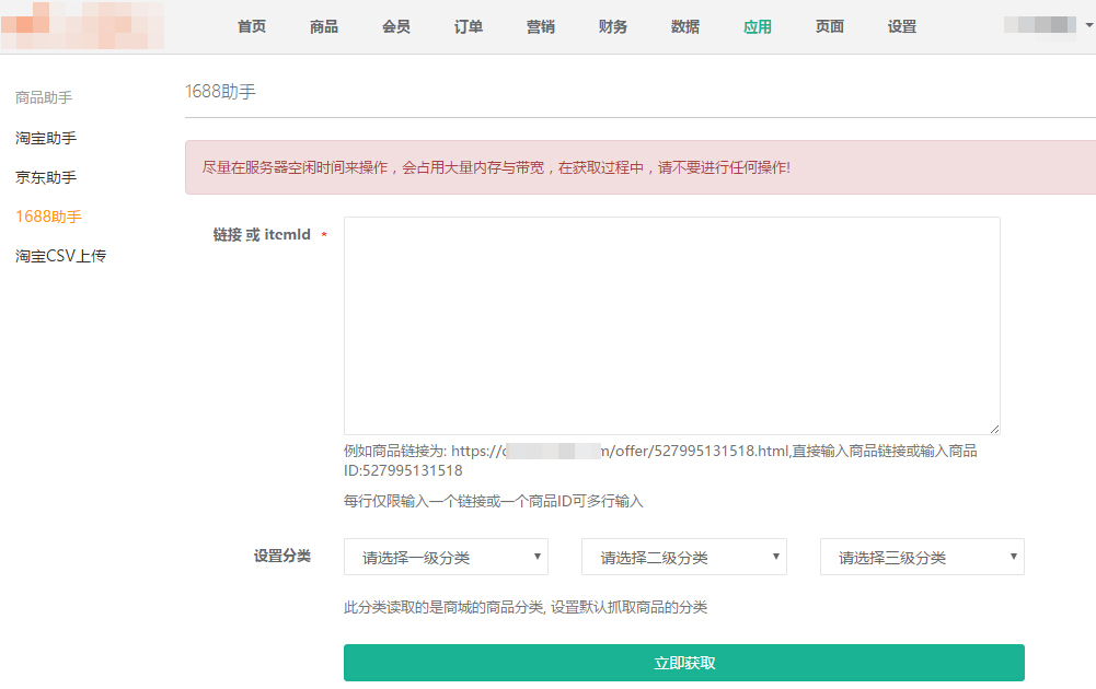 获取的商品链接为:http://item.taobao.com/item.htm?id=522155891308或:http://detail.tmall.com/item.htm?id=522155891308直接输入商品链接或输入商品ID:522155891308每行仅限输入一个链接或一个商品ID,可多行输入,批量获取商品。