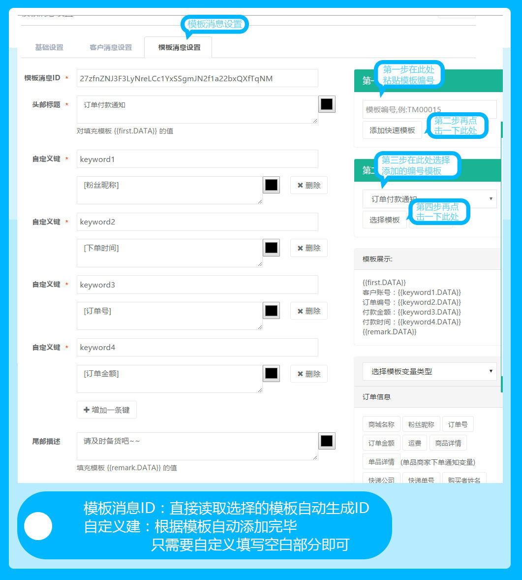 模板消息设置,直接在接入的公众号中选择复制需要使用的模板编号;