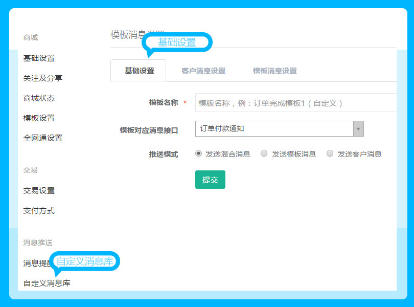 首先要在基础设置中选择需要推送的模式,然后在选择相应的模板对应接口,单机设置——自定义消息库——基础设置,参见下图: