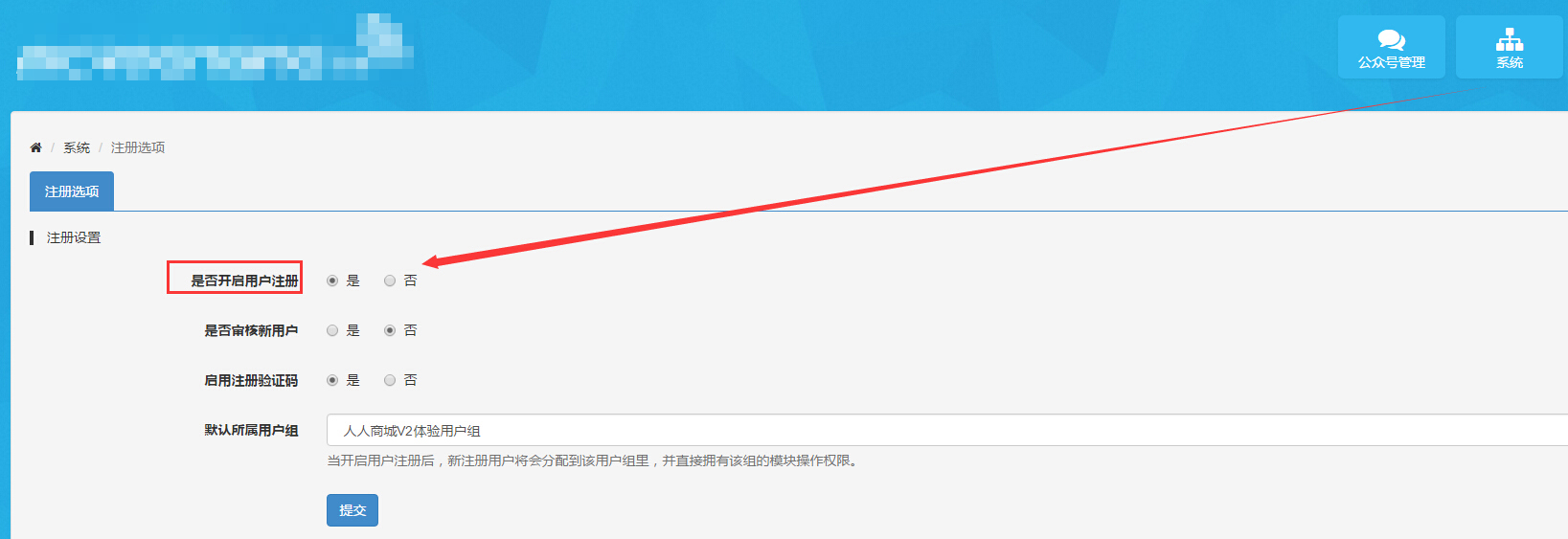 温馨提示:商城网站信息设置完毕后,可直接通过商城网站首页登录或注册账号,如果PC站点无“注册”按钮,则需要点击知品——系统——注册选项——是否开启用户注册,参见下图: