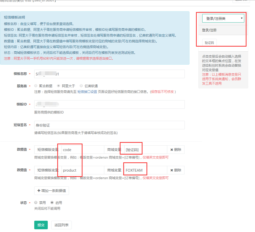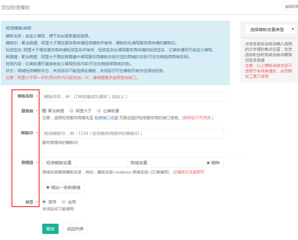 数据值:聚合数据、阿里大于需在数据值中填写服务商模板变量对应的商城的变量(可在右侧选择商城变量)。