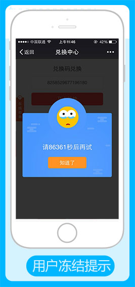 冻结用户兑换资格:用户退出再次扫描别的二维码或输入正确的兑换码时,此用户已被冻结,会给予相应的提示,即使更改过来也得过了冻结期才能再次扫码或输入兑换码进行兑换,参见下图: