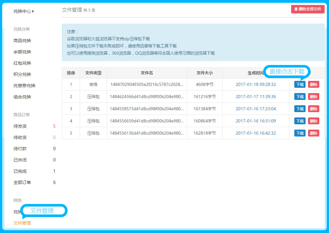 文件管理是统计各任务中心生成的二维码或者兑换码的,直接点击下载即可,(针对在生成兑换码没有及时下载的商家,可直接通过此处下载即可哦)参见下图: