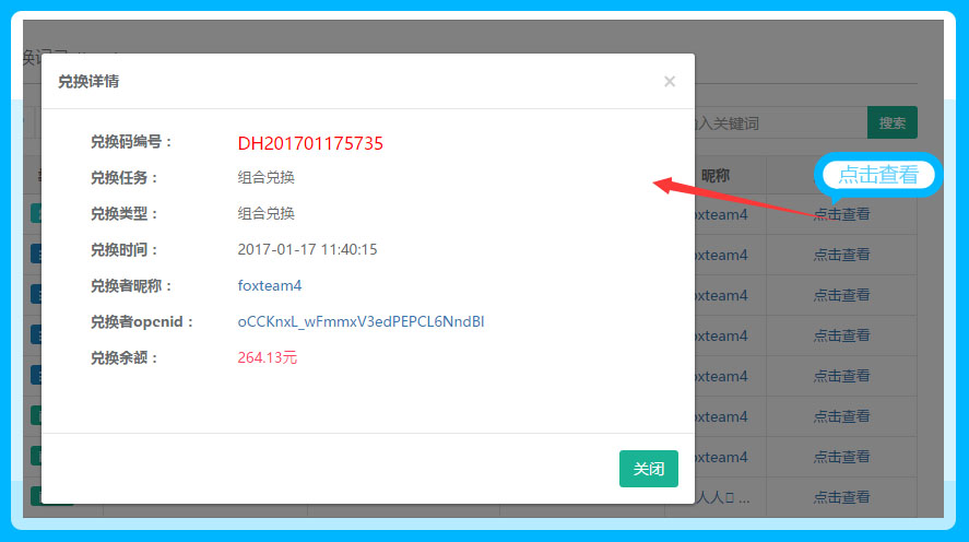 兑换记录中可查看会员兑换的任务类型,兑换码的编号和所属的任务及兑换的时间等信息,点击查看,可显示会员兑换任务的详情信息,参见下图: