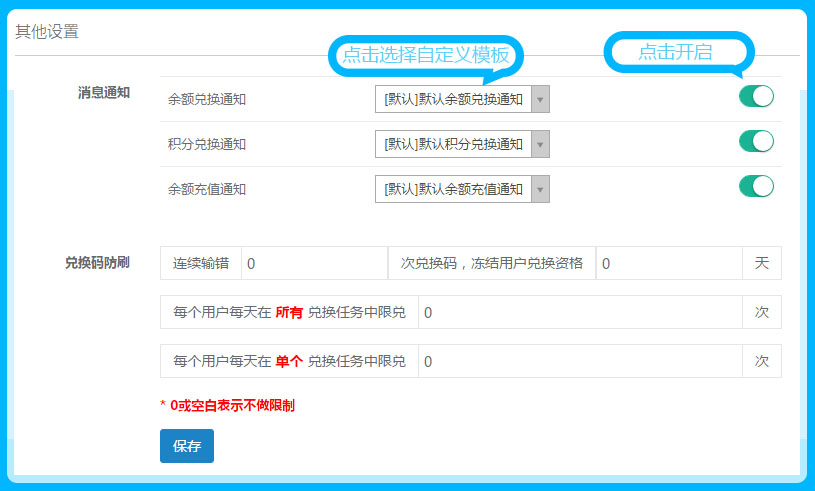 兑换中心的消息通知需要在此处单独开启,如需要自定义设置的话,在设置——自定义模板中进行添加,设置相应的变量信息即可,在此处进行选择自定义的模板,就会收到自定义消息的信息,参见下图: