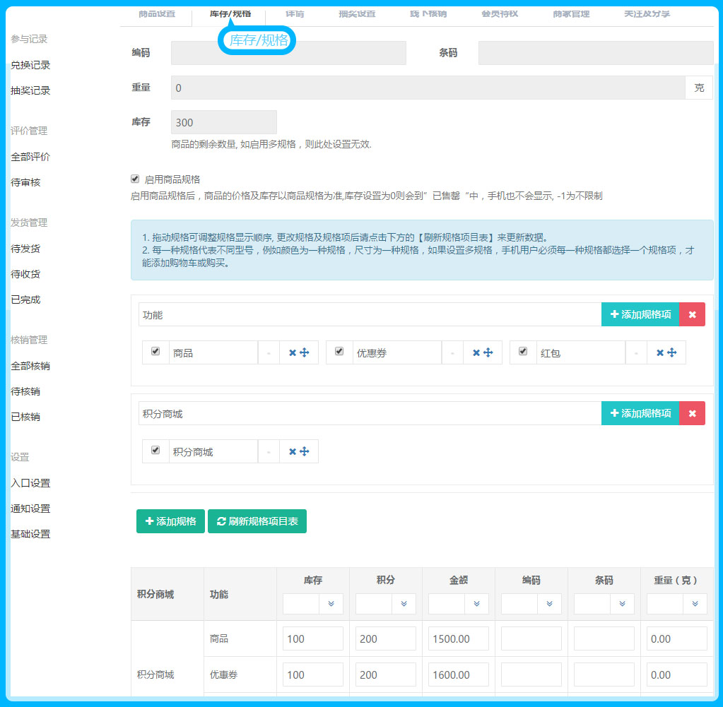 点击【库存/规格】——【启用商品规格】,参见下图: