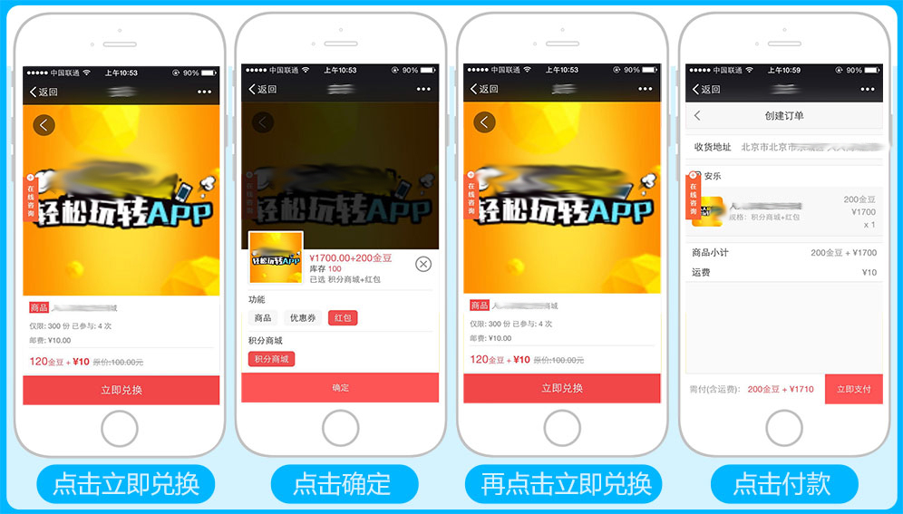 其操作规则与商城商品启用商品规格一致(点击查看商品启用规格),会员点击【立即兑换】选择相应的规格后,要再次点击【立即兑换】,才到支付页面,参见下图: