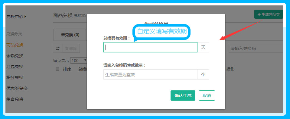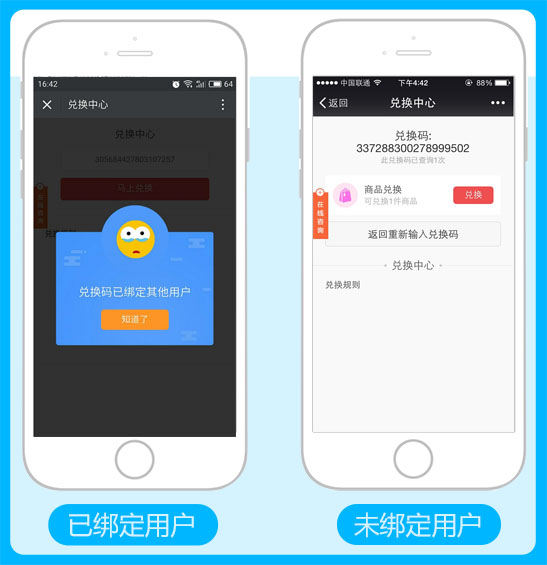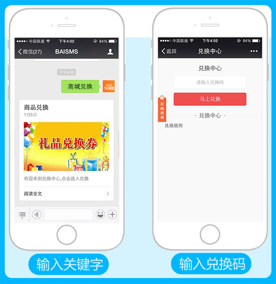 3、此类型的兑换方式,需要会员输入关键字进入(点击查看关键字设置),然后手动输入兑换码进行兑换,参见下图: