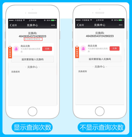 查询次数:勾选“显示”在兑换的时候可查看到二维码或这是此兑换码的查询的次数信息,反之则不显示,参见下图: