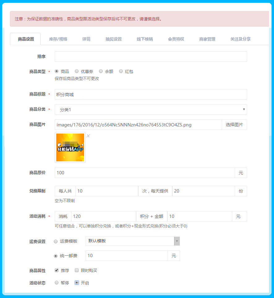 商品类型:点击选择(商品)保存后,此类型将无法修改