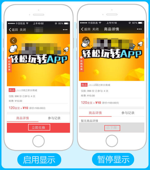 活动状态:勾选“开启”才能对商品兑换,反之则不能兑换,显示商品下架,且不在首页显示,参见下图:
