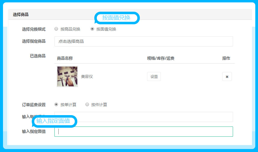 此项功能的设置是针对选择兑换商品模式及运费等商品的设置,具体如下: