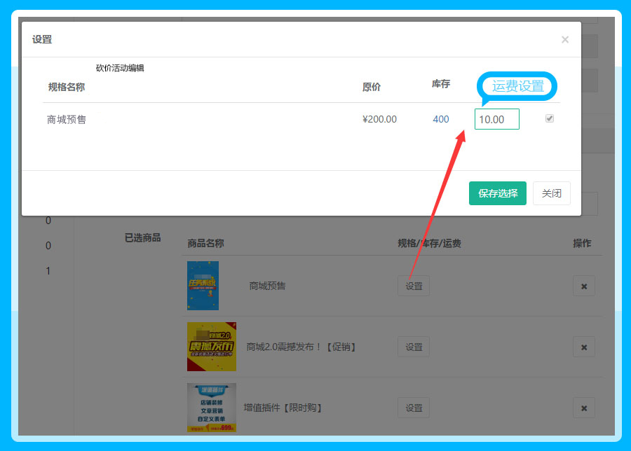 2、超出的商品运费要在添加商品的时候,点击设置进行运费信息的设置,参见下图: