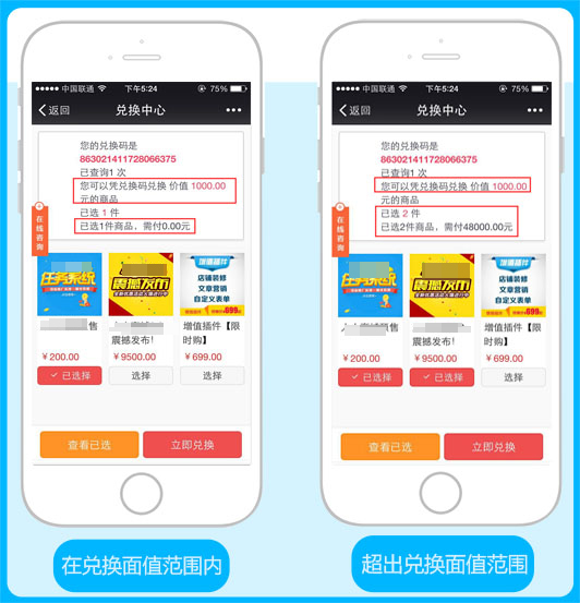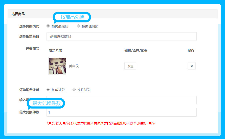 温馨提示:1、最大兑换数为0或空,则所有选的商品和规格可以全部按0元兑换,商家要谨慎操作