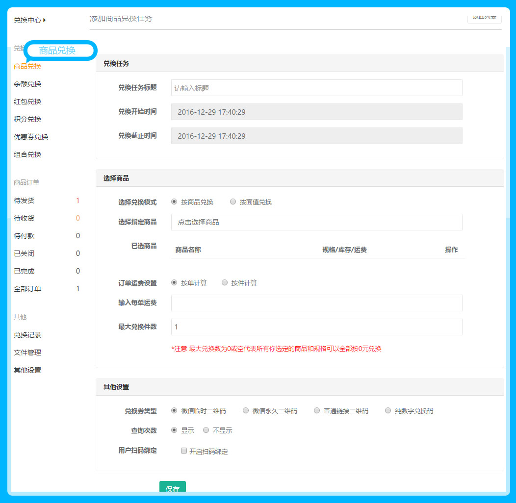 兑换开始时间/结束时间:兑换的开始/时间系统默认的是当前的时间,需要商家重新设置,兑换任务的时间范围