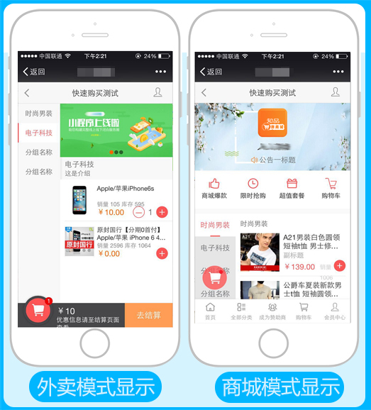 知品微商城的快速购买应用插件的外卖模式和商城模式有以下区别: