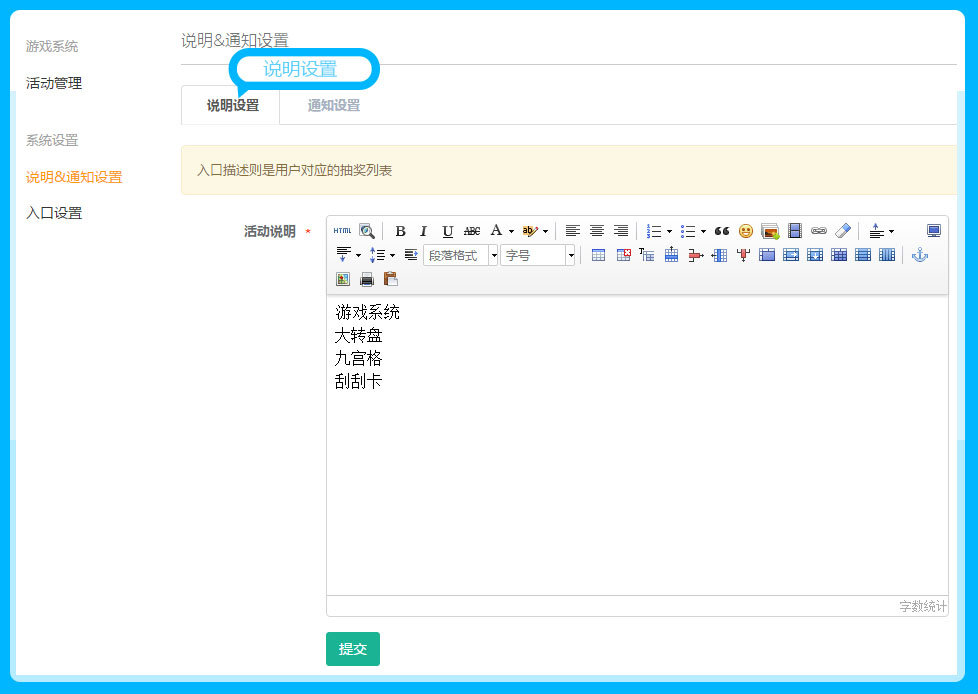 知品微商城游戏系统的规则说明,可直接点击说明&通知设置——说明设置,进行填写说明游戏系统规则说明,参见下图: