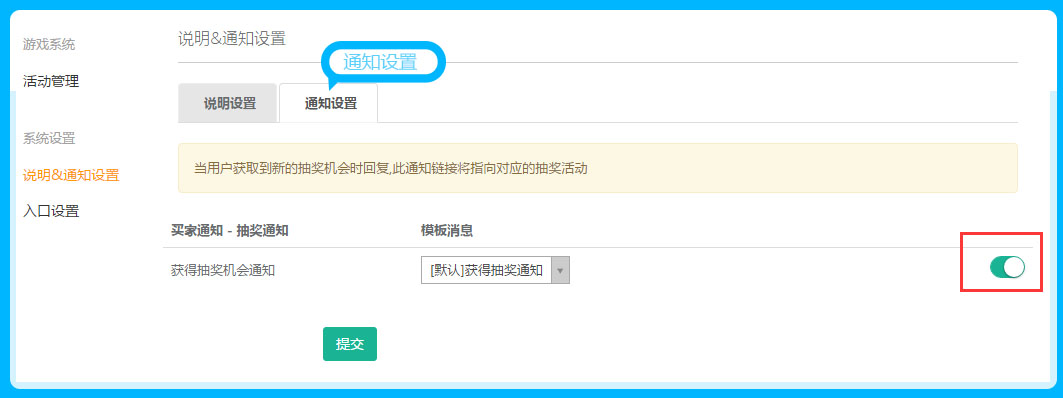 知品微商城游戏系统的通知设置,只有是买家的通知设置,需要单独的开启,点击说明&通知设置——通知设置——开启,参见下图: