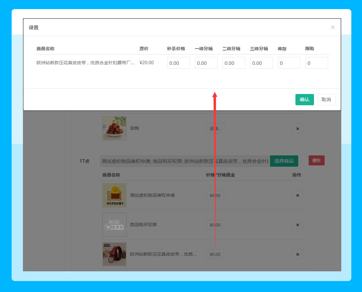 1、知品微商城整点秒杀功能的分销需要进行重新设置,整点秒杀不读取系统任何分销设置,需要在添加秒杀商品时进行重新配置 ,参见下图:
