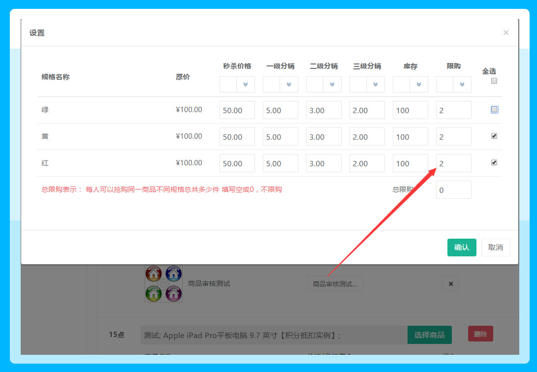 2、独立设置商品某规格的限购数量(不读取商城基础设置);设置总限购数量(针对商品限制,不对规格进行限制); 商品设置仅限某一个或多个规格参与秒杀 (A商品共5个规格,可是只3个规格参与秒杀)