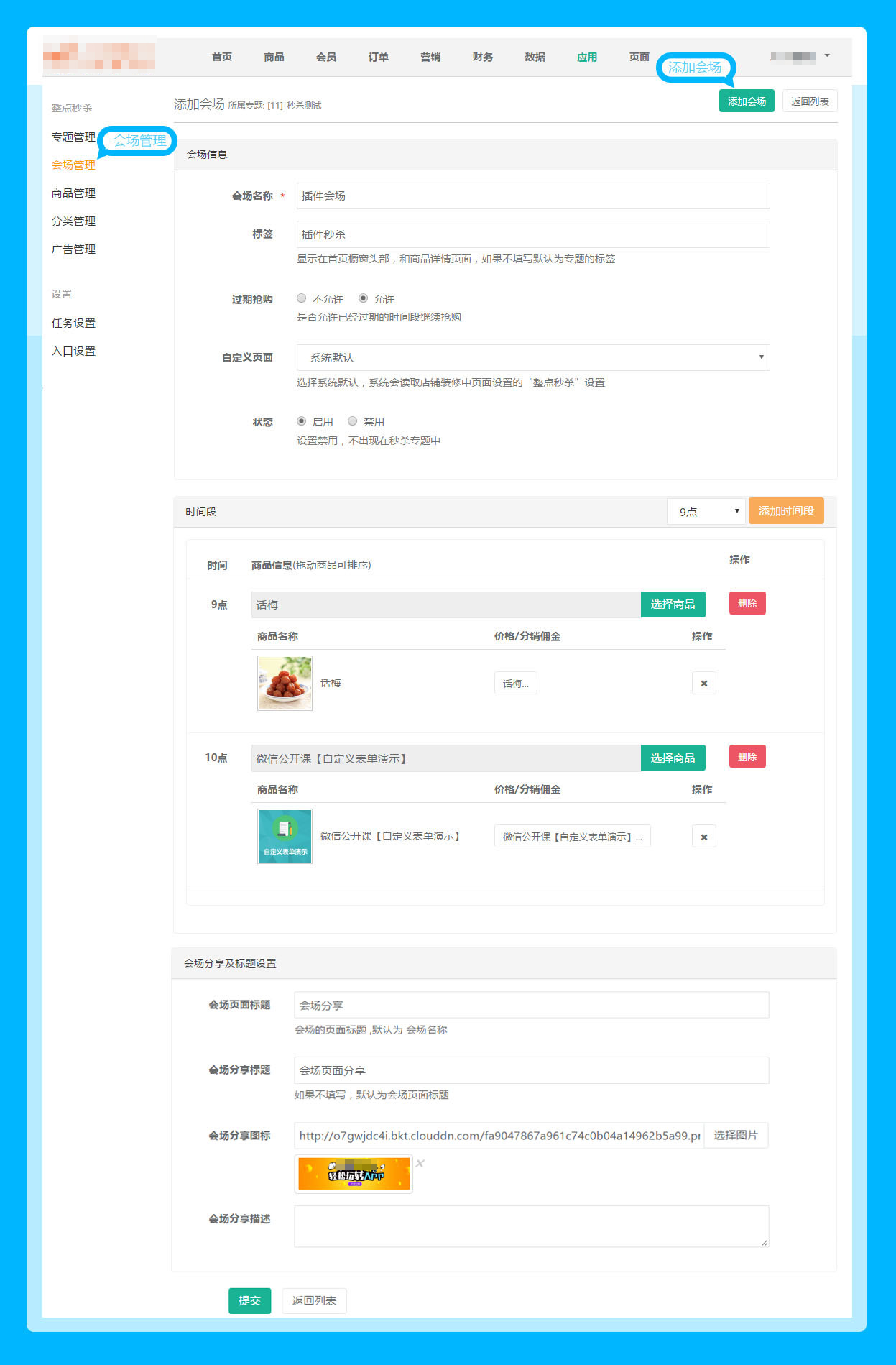 点击专题列表某专题的【会场】——【添加会场】,填写名称,选择在专题中的时间点添加商品等信息,参见下图: