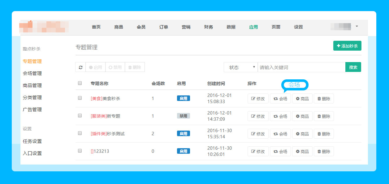 知品微商城整点秒杀的第二步是秒杀的会场添加,会场只能是在先添加专题后才能进行添加会场的,商家点击【会场管理】没有添加会场的按钮,只能通过专题的列表中的某个专题进行添加,具体如下: