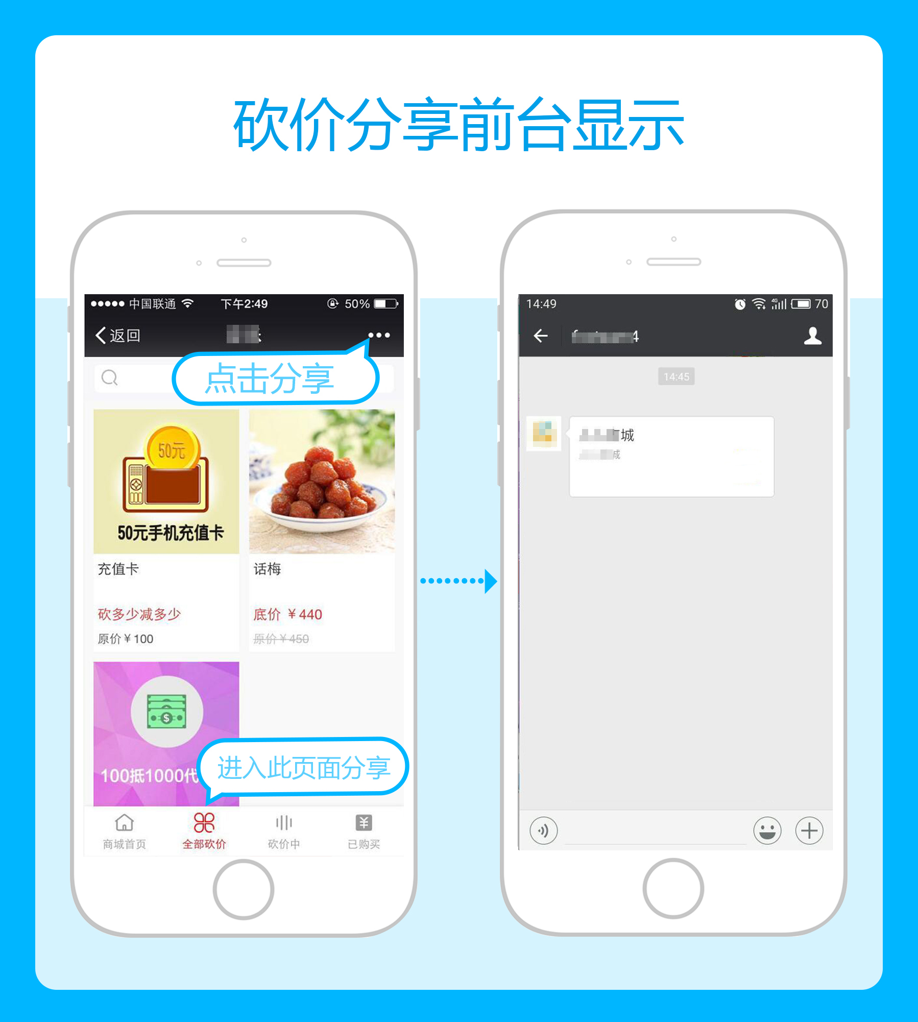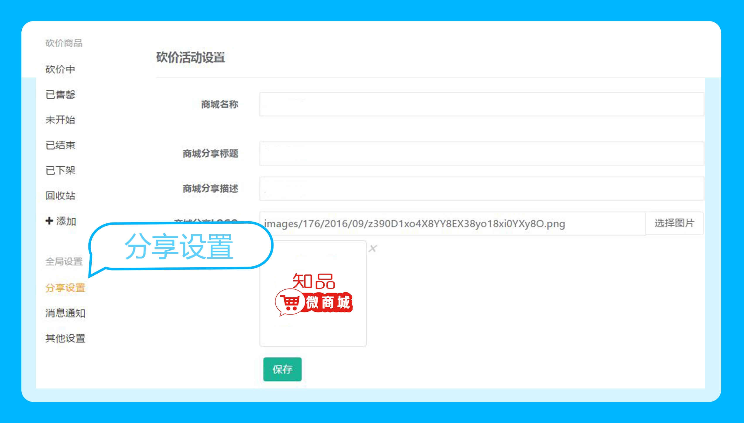 知品微商城的砍价活动分享设置,填写商城的名称、分享的标题、分享的描述信息、分享的LOGO信息,在将参与砍价活动的商品分享出去时直接显示,参见下图: