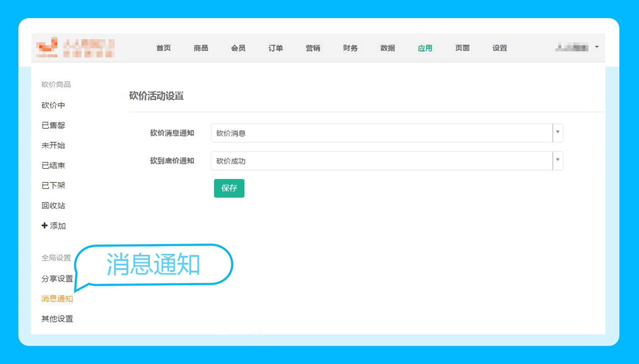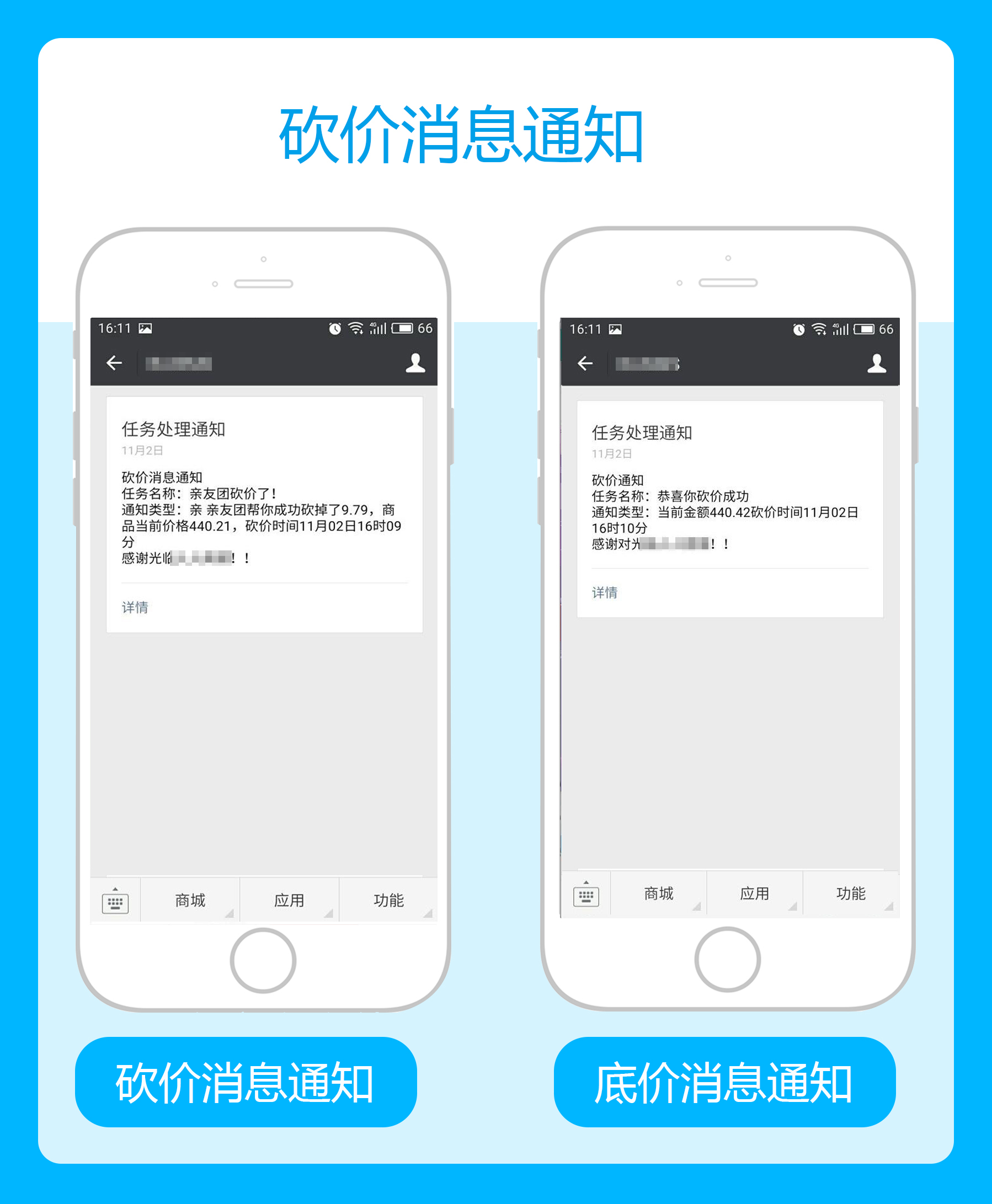 消息通知是设置发起的砍价活动亲友团砍价消息和砍到底价通知,在选择前需要在模板消息库中添加模板,在进行选择设置,参见下图: