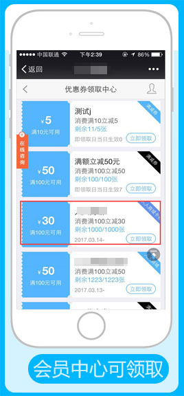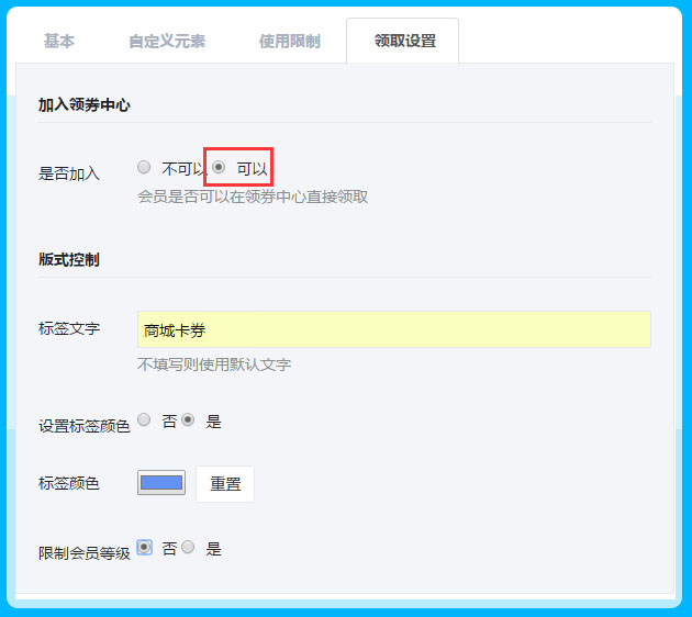 1、点击【领取设置】——【是否加入】——【可以】,即可在会员中心领取,参见下图: