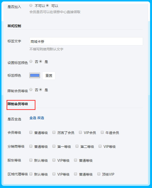 知品微商城微信卡券在会员中心领取支持限制会员等级的领取,勾选哪个等级则有权限领取反之则无权限领取,参见下图: