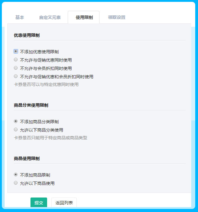 知品微商城微信卡券支持自定义设置使用的限制,其设置和优惠券使用限制相一致,参见下图: