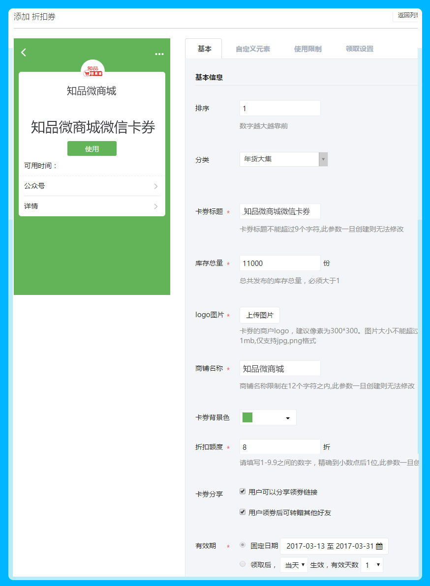 卡券标题:自定义填写微信卡券的标题信息