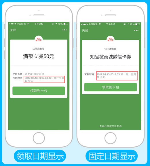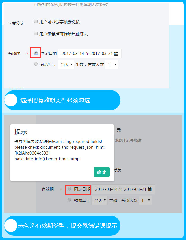 有效期:系统支持自定义选择固定日期和领取后n天可使用,在规定时间内进行使用,过期则不能使用,参见下图: