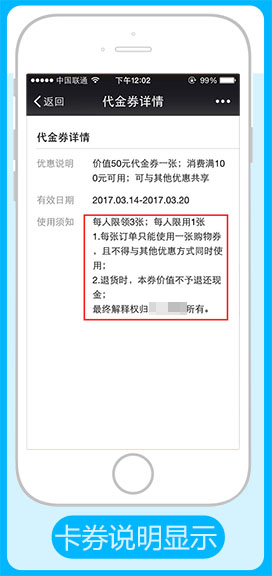 使用须知:自定义填写卡券的使用文明情况,会员领取在卡券详情中查看即可,参见下图: