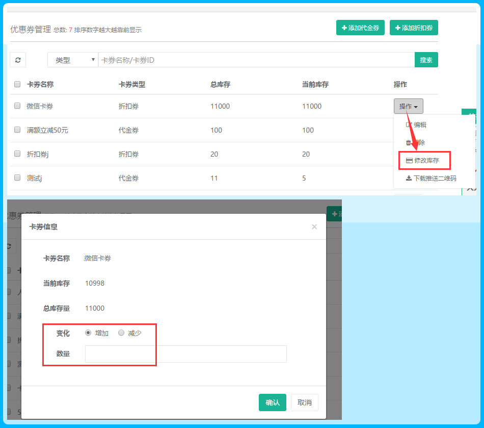 2、库存总量支持修改,但是提交后需要在列表中点击【操作】-【修改库存】进行修改,参见下图: