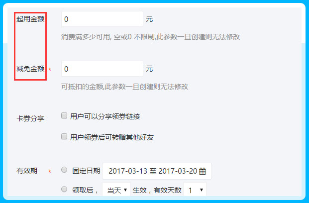 1、卡券标题、LOGO图片、商铺名称、起用金额、减免金额、有效期选择一旦设置提交后将无法更改信息,操作提交时需准确填写卡券信息