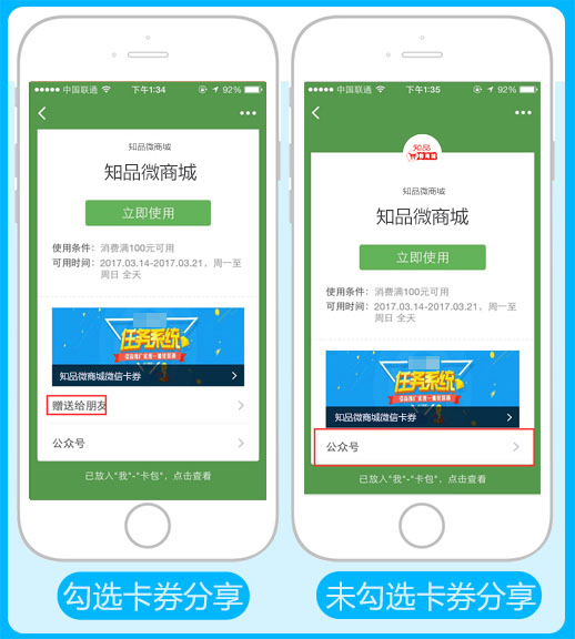 卡券分享:勾选可分享微信卡券,不勾选则不支持分享,参见下图: