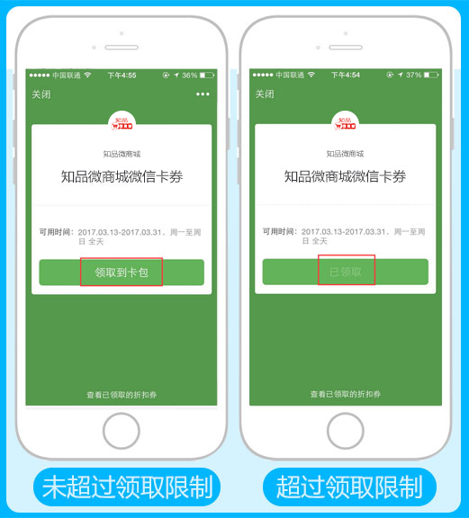 领券限制:自定义填写会员可领取的卡券上限数量,必须大于1,不填写或者小于1则都会默认为1张,超过后则不能进行领取,参见下图: