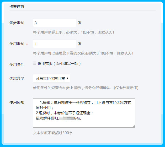 使用限制:自定义填写限制每个会员使用微信卡券的次数,必须大于1,小于或者不填写则默认为1张,超过则不能使用
